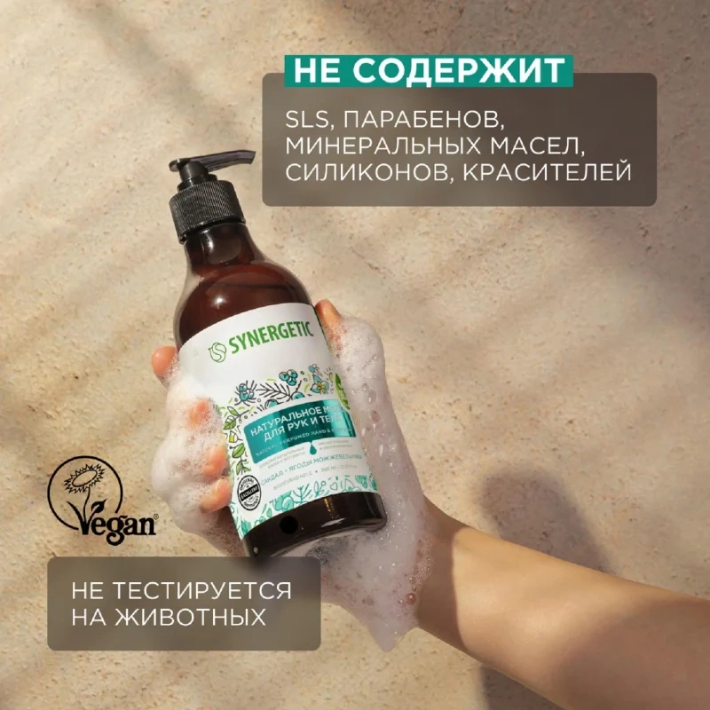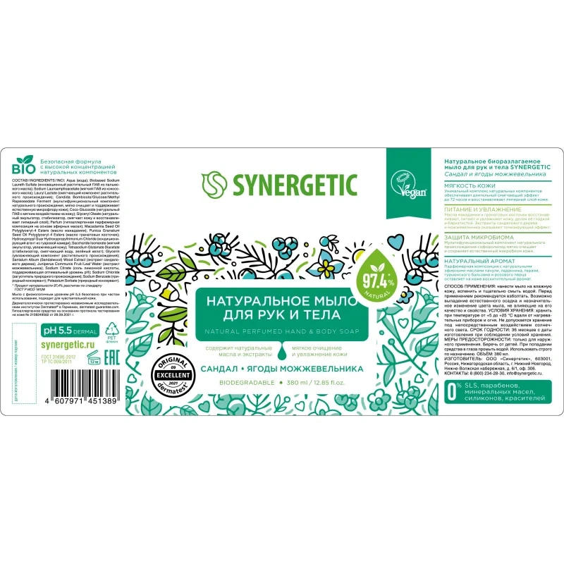 Назначение: натуральное биоразлагаемое мыло для рук и тела Synergetic Сандал и ягоды можжевельника — это деликатное средство для очищения кожи, на 99.2% состоящее из натуральных компонентов. Гипоаллергенный аромат мыла разработан в швейцарском доме Givaudan с использованием натуральных эфирных масел пачули, ладанника, герани, гурьюнского бальзама и розового перца. Масла макадамии и гранатовых косточек восстанавливают, питают и увлажняют кожу, делая её гладкой и бархатистой. Экстракты сандалового дерева и можжевельника увлажняют кожу и оказывают тонизирующий эффект. Софоролипид из рапсового масла мягко очищает и сохраняет естественный микробиом кожи. Уникальный комплекс натуральных компонентов на основе глицерина и растительных сахаров обеспечивает длительный смягчающий эффект до 72 часов. Физиологичный уровень pH 5.5 гарантирует мягкость кожи и безопасность при частом использовании даже для чувствительной кожи. Натуральное мыло сертифицировано британской организацией The Vegan Society.