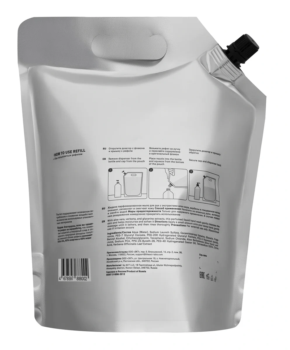 Жидкое парфюмированное мыло для рук мягко очищает кожу, увлажняет и смягчает её. Новое жидкое мыло The Act сочетает в себе мощные природные антисептики и уход за руками с эффектом увлажнения и заживления микротрещинок. Формула мыла содержит антибактериальные компоненты растительного происхождения и мягкие ПАВ, которые эффективно очищают и ухаживают за кожей, не пересушивая и не раздражая ее. Лимонная кислота убивает микробы, оптимизирует рН-баланс и одновременно создает тонкую пленочку, которая защищает от пересушивания и чрезмерного испарения влаги. Парфюмированное жидкое мыло для рук мягко очищает кожу, увлажняет и смягчает ее. Мягкий ПАВ создает обильную пену, которая притягивает все загрязнения и бактерии и очищает кожу без пересушивания и агрессивного воздействия на гидролипидный барьер. Компоненты мыла способствуют заживлению мелких повреждений кожи и помогают противостоять пигментации и раннему старению.