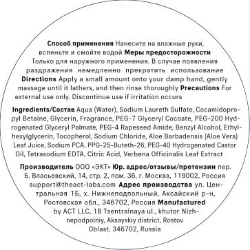 Жидкое парфюмированное мыло для рук мягко очищает кожу, увлажняет и смягчает её. Новое жидкое мыло The Act сочетает в себе мощные природные антисептики и уход за руками с эффектом увлажнения и заживления микротрещинок. Формула мыла содержит антибактериальные компоненты растительного происхождения и мягкие ПАВ, которые эффективно очищают и ухаживают за кожей, не пересушивая и не раздражая ее. Лимонная кислота убивает микробы, оптимизирует рН-баланс и одновременно создает тонкую пленочку, которая защищает от пересушивания и чрезмерного испарения влаги. Парфюмированное жидкое мыло для рук мягко очищает кожу, увлажняет и смягчает ее. Мягкий ПАВ создает обильную пену, которая притягивает все загрязнения и бактерии и очищает кожу без пересушивания и агрессивного воздействия на гидролипидный барьер. Компоненты мыла способствуют заживлению мелких повреждений кожи и помогают противостоять пигментации и раннему старению.