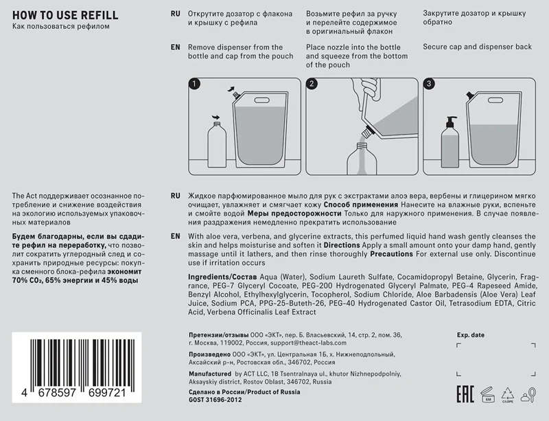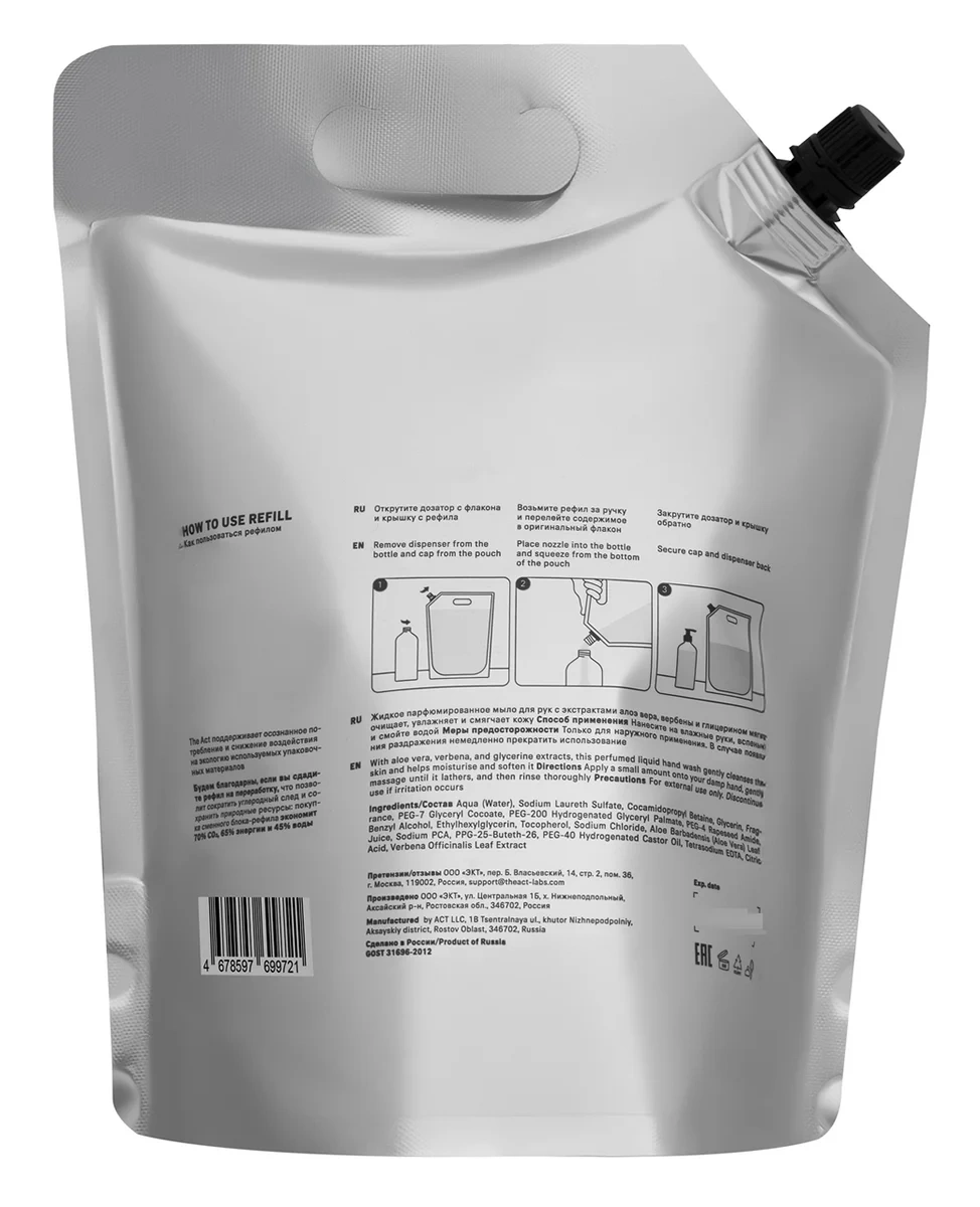 Благодаря экстрактам алоэ вера, вербены и глицерина это парфюмированное жидкое мыло для рук нежно очищает кожу, увлажняет и смягчает ее. Новое жидкое мыло The Act c ароматом вербены и цитрусовыми нотками сочетает в себе мощные природные антисептики и уход за руками с эффектом увлажнения и заживления микротрещинок. Формула мыла содержит антибактериальные компоненты растительного происхождения и мягкие ПАВ, которые эффективно очищают и ухаживают за кожей, не пересушивая и не раздражая ее. Лимонная кислота убивает микробы, оптимизирует рН-баланс и одновременно создает тонкую пленочку, которая защищает от пересушивания и чрезмерного испарения влаги. Растительный глицерин обладает высокой гигроскопичностью и притягивает влагу к поверхности кожи, предотвращая ощущение сухости и дискомфорта после мытья рук. Алое вера увлажняет и оказывает антибактериальное и антиоксидантное действия. Касторовое масло обладает целебными свойствами и бережно восстанавливает потрескавшуюся кожу рук. Вербена помогает поддержать упругость, тонизирует и смягчает. Парфюмированное жидкое мыло для рук мягко очищает кожу, увлажняет и смягчает ее. Мягкий ПАВ создает обильную пену, которая притягивает все загрязнения и бактерии и очищает кожу без пересушивания и агрессивного воздействия на гидролипидный барьер. Компоненты мыла способствуют заживлению мелких повреждений кожи и помогают противостоять пигментации и раннему старению. Легкий цитрусовый аромат вербены освежает и тонизирует.