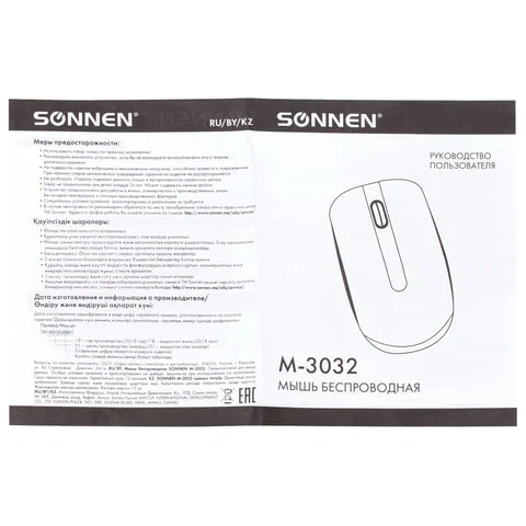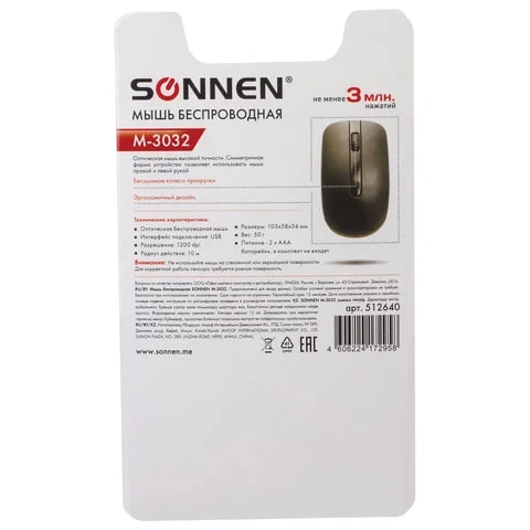 SONNEN М-3032 - компьютерная мышь классического дизайна по доступной цене. Обеспечит удобство в работе. Достоинства: высокая долговечность и лаконичный дизайн. Характеристики Разъем: USB Радиус действия: 10 м Технология сенсора: оптическая Количество кнопок: 3 Максимальное разрешение курсора: 1200 dpi Тип питания: 2 батареи ААА Основной цвет корпуса: черный Дополнительный цвет корпуса: черный Длина: 103 мм Ширина: 58 мм Высота: 34 мм Вес: 50 г Упаковка: блистер с европодвесом Вес: 0.0500 кг. Объем: 0.0006 м3. Артикул производителя: 512640. Штрих-код: 4606224172958. Производитель: Китай. Гарантия: 12 месяцев. Данный товар, при условии соблюдения гарантийного срока, подлежит обслуживанию в ООО «Офисмаг СПБ»