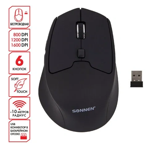 Мышь беспроводная SONNEN V33, USB, 800/1200/1600 dpi, 6 кнопок, оптическая, черная, SOFT TOUCH, 5135