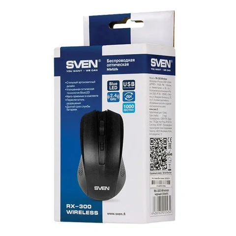 Мышь беспроводная SVEN RX-300, 3 кнопки + 1 колесо-кнопка, оптическая, черная, SV-032, SV-03200300W
