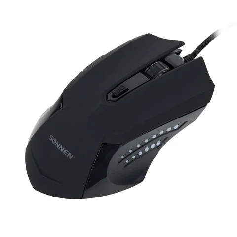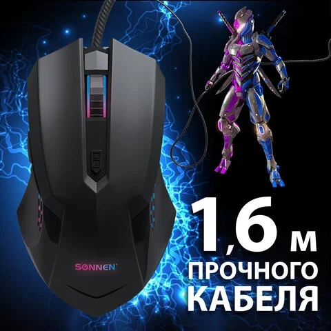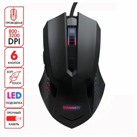 Мышь проводная игровая SONNEN I3, пластик, 6 кнопок, 800-3200 dpi, LED-подсветка, черная, 513523