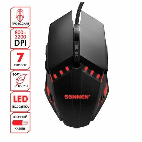 Мышь проводная игровая SONNEN Z5, металл/пластик, 7 кнопок, 800-3200 dpi, RGB-подсветка, черная, 513