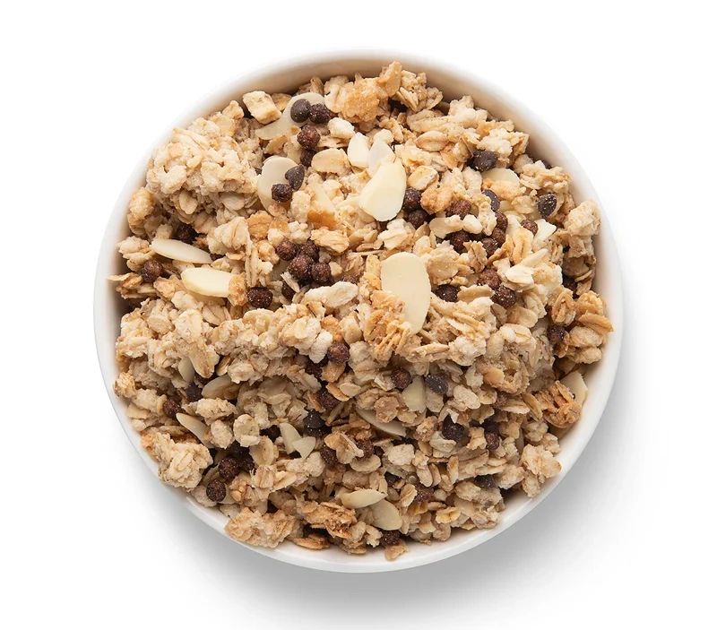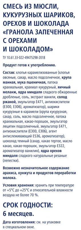 Запеченные хрустящие мюсли (хлопья овсяные, растительные пищевые волокна, овсяные и пшеничные отруби, пшеничная и рисовая мука, подсолнечное масло, подсластитель сукралоза - из растительного сырья, ячменный солод, соль), миндальный орех, сушеная вишня. Возможна присутствие незначительного количества семян кунжута, орехов, люпина, молочных и соевых продуктов.