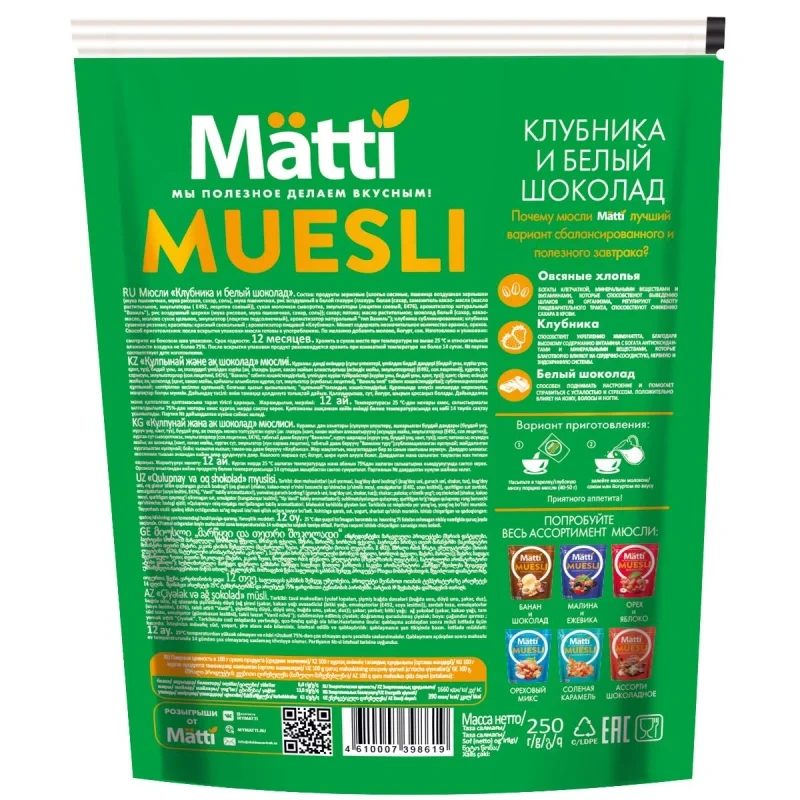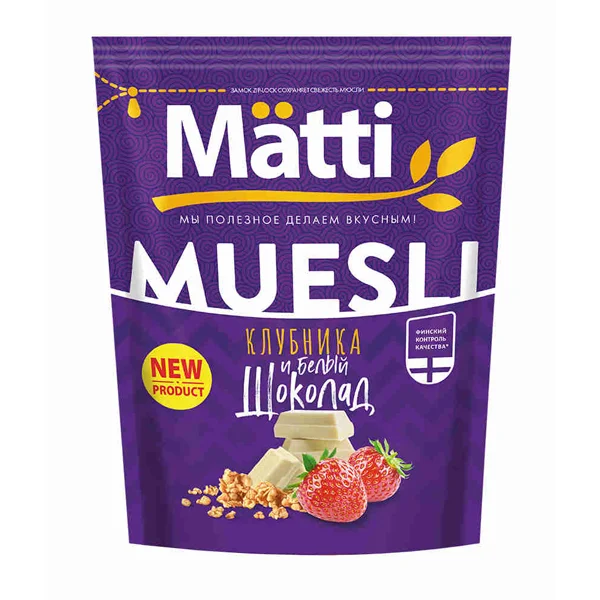 Мюсли Matti Клубника и белый шоколад — хрустящие кранчи мюсли из цельного зерна. Идеальное сочетание злаков и ягод.