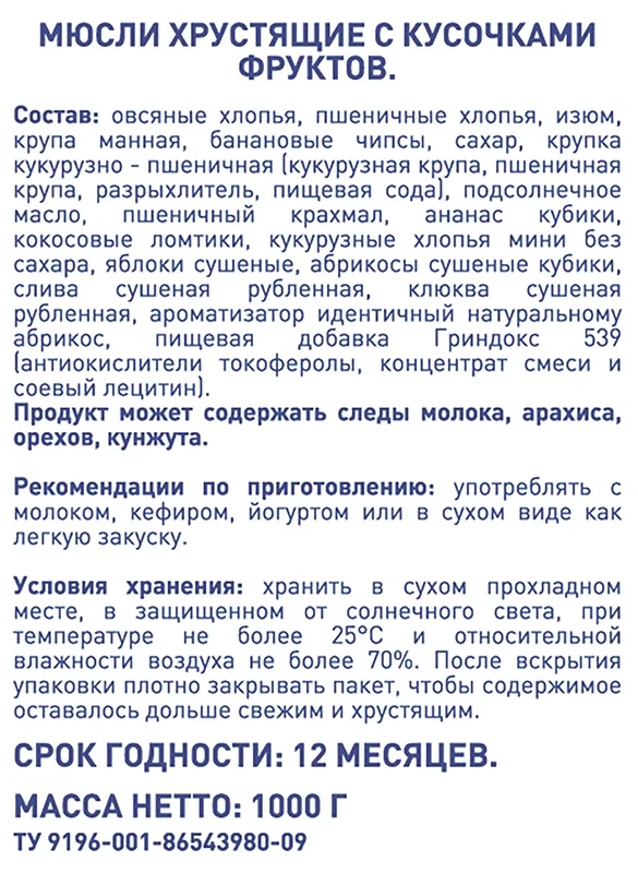 Мюсли METRO Chef хрустящие с кусочками фруктов, 1 кг– незаменимый продукт для тех, кто придерживается принципов здорового питания или вегетарианцев. Благодаря оптимальному сочетанию кусочков сушеных фруктов и злаков может использоваться в качестве полноценного завтрака, быстрого перекуса после тренировки или в дороге. Мюсли можно запивать молоком, кефиром, йогуртом, соком или любым другим напитком по в??усу. При желании добавлять в каши, творог, фруктовые салаты и десерты. В составе продукта не содержится вредных для здоровья компонентов, поэтому есть его можно даже детям.