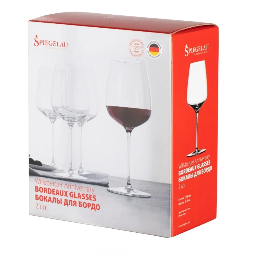 Набор бокалов для красного вина Spiegelau Willsberger Anniversary, 635 мл х 2 шт. был созданы специально для дегустации благородных, высокотанинных вин Бордо класса премиум. Их тюльпанообразная форма позволяет вину обильно насыщаться кислородом, раскрывая всю многослойность вкуса и аромата, а большой объем чаши (635 мл) способствует тому, чтобы при дегустации сложных вин кислотность гармонично проявляется, не ослабляя вкус вина. Только в бокалах Виллсбергер Коллекшн Бордо знаменитые французские вина смогут проявить себя в полной красе, раскрыв самые потаенные нюансы вкуса и аромата. Изумительная коллекция изготовленных вручную бокалов Willsberger Collection от Шпигелау отличается превосходным современным стилем, сочетающим непревзойденную элегантность и практичность. Бокалы этой коллекции украсят собою любой стол, станут изысканным подарком и, конечно, помогут раскрыть и подчеркнуть все лучшее, что таят в себе Ваши любимые напитки. Дополнительным плюсом является то, что для их производства используется хрустальное стекло (Crystalline), не содержащее свинца, благодаря чему бокалы отличаются экологичностью, тонкостью и прочностью, сохраняя при этом лучшие характеристики хрусталя — неповторимый звон и сияние.