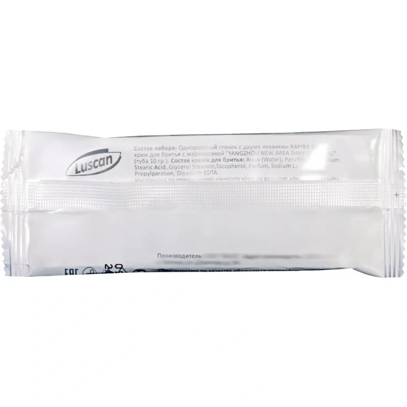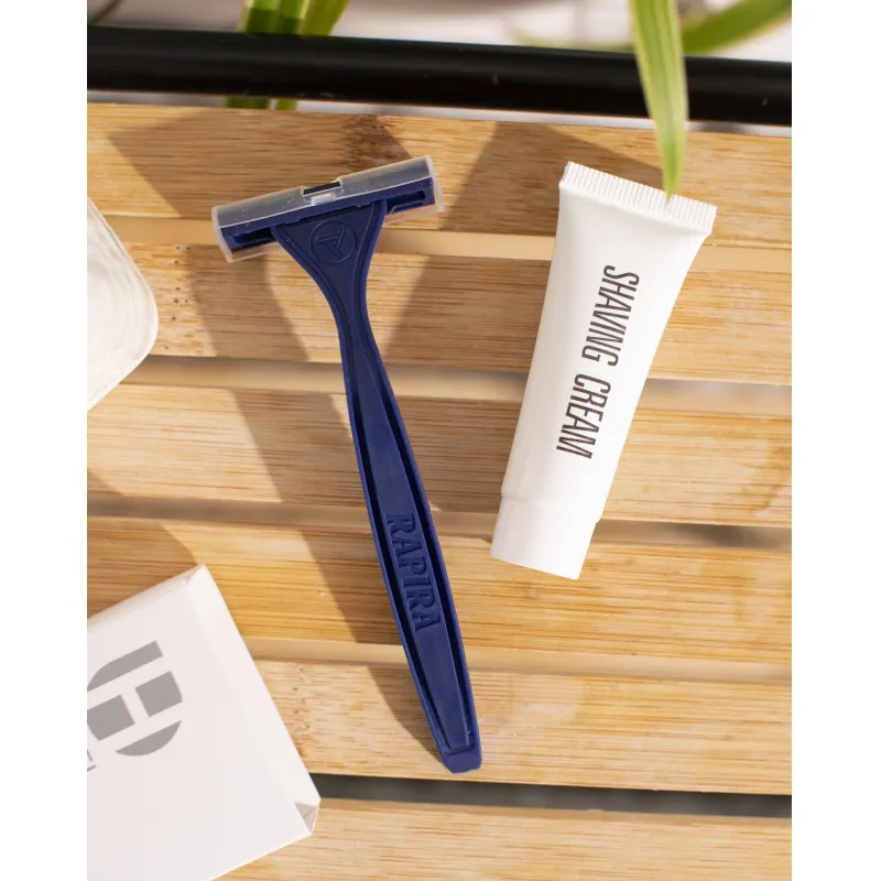 Набор бритвенный Luscan Hotel collection флоупак (бритва, крем для бритья, 200 штук в упаковке)Предназначен для комфортного и гигиеничного бритья в условиях временного размещения. В состав входят одноразовая пластиковая бритва с двумя лезвиями, увлажняющей полоской и съёмной защитной крышкой для головки, а также крем для бритья в тюбике объёмом 10 мл. Средство обладает подходящей консистенцией и облегчает процесс бритья. Каждый комплект упакован в индивидуальный герметичный флоупак из полиэтилена.
