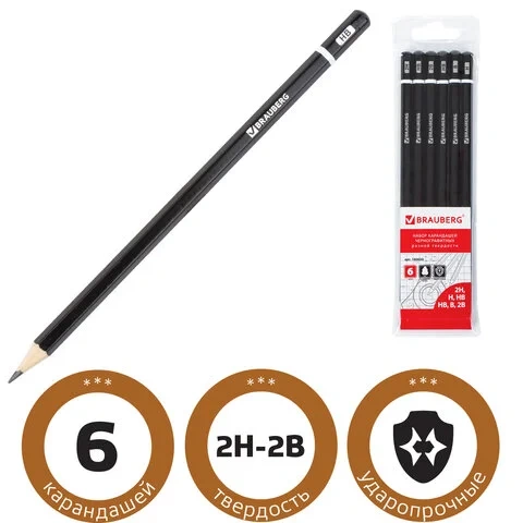 Набор чернографитных карандашей Brauberg Touch line 2H-2B, 6шт, черный корпус