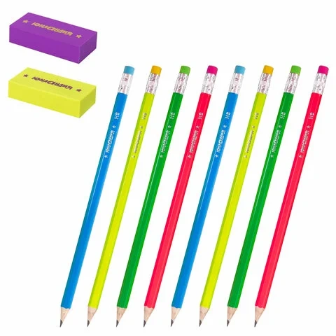 Набор чернографитных карандашей Юнландия Неончики 8шт, 2 ластика