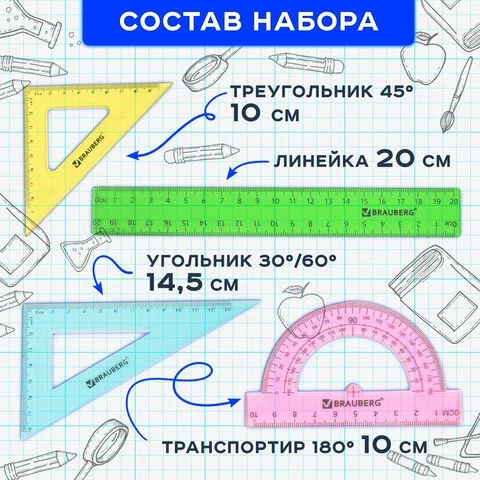 | Комплектация | большой треугольник, линейка, малый треугольник, транспортир |