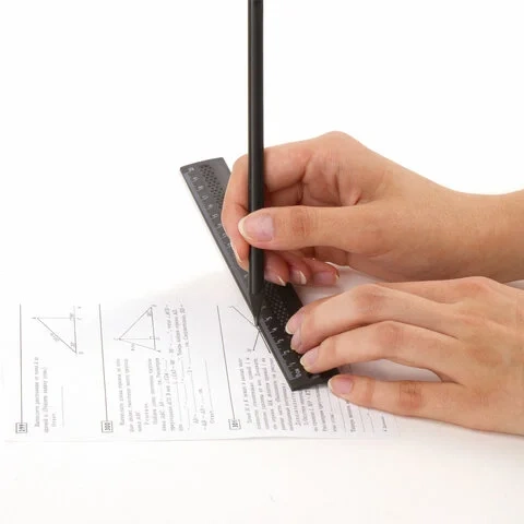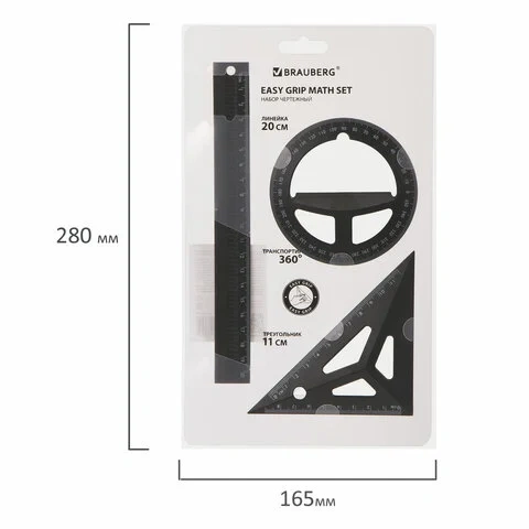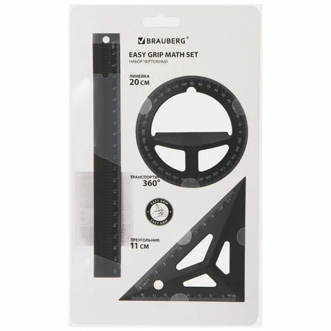 Набор чертежный BRAUBERG объёмный (линейка 20 см, угольник, транспортир), черный, подвес, 210746