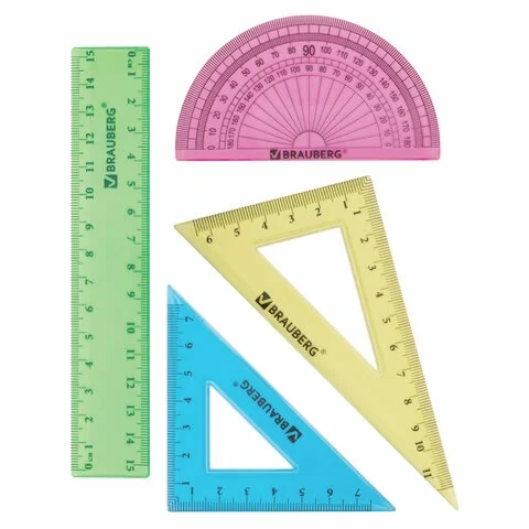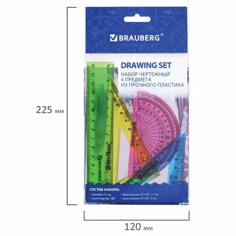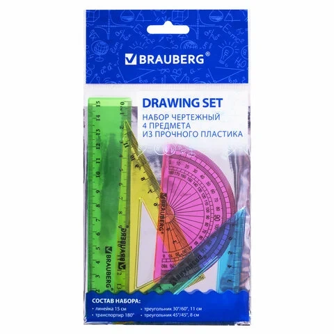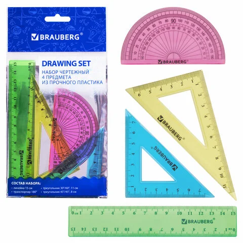 Набор чертежный Brauberg Сrystal 4 предмета, линейка 15см, 2 треуг., транспортир, цветной