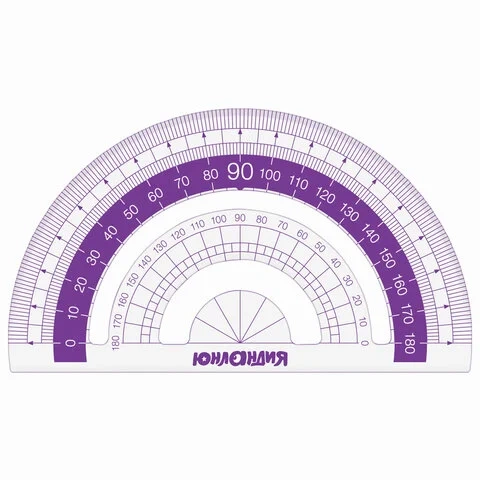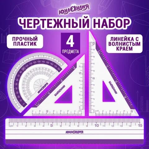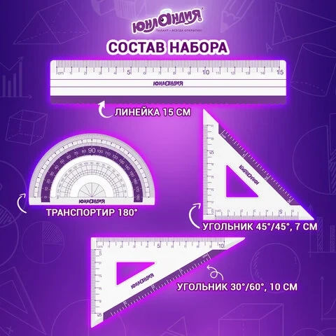 Набор чертежный малый ЮНЛАНДИЯ 'ГЕОМЕТРИЯ' (линейка 15 см, 2 треугольника, транспортир), фиолетовая