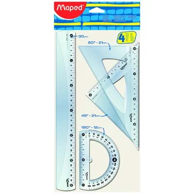 В набор входят четыре предмета: Линейка со шкалой 30 см. Треугольник 60/30 и шкалами 21 см, Треугольник 45/45 и шкалами 21 см. Транспортир 180 градусов с держателем со шкалой 12 см.