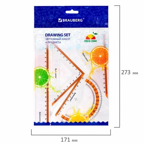Набор чертежный BRAUBERG 'FRESH ZONE' изготовлен из прочного прозрачного пластика со шкалой оранжевого цвета. Поставляется в пластиковом пакете с европодвесом.