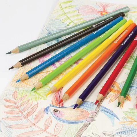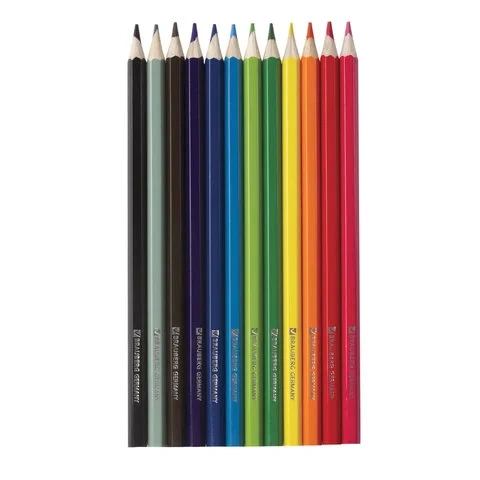 Набор состоит из 12 цветов: розовый, красный, желтый, оранжевый, салатовый, зеленый, голубой, синий, фиолетовый, коричневый, серый, черный. Шестигранная форма сечения корпуса позволяет не скатываться карандашу с поверхности стола во время занятий рисованием. Они изготовлены из древесины ценных пород и имеют лакированный корпус. Высокосортная древесина и качество исполнения гарантируют легкую заточку. Благодаря высококачественному грифелю диаметром 3 мм рисунок ляжет на бумагу густо, сплошной четкой линией. Все карандаши заточены и поставляются в картонной упаковке с европодвесом.