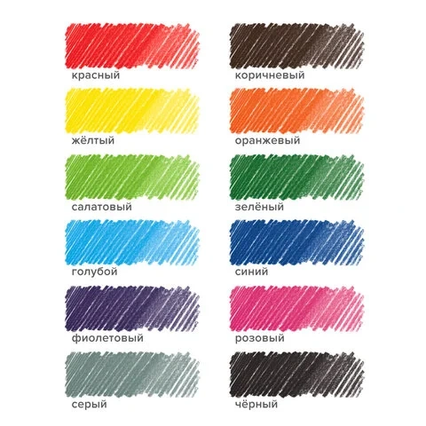 Набор состоит из 12 цветов: розовый, красный, желтый, оранжевый, салатовый, зеленый, голубой, синий, фиолетовый, коричневый, серый, черный. Увеличенный трехгранный корпус удобен для захвата и снижает напряжение кисти при рисовании. Также трехгранная форма позволяет не скатываться карандашу с поверхности стола во время занятий рисованием. Карандаши изготовлены из древесины ценных пород и имеют лакированный корпус. Высокосортная древесина и качество исполнения гарантируют легкую заточку. Благодаря высококачественному увеличенному грифелю диаметром 5 мм рисунок ляжет на бумагу густо, сплошной четкой линией. Все карандаши заточены и поставляются в картонной упаковке с европодвесом.