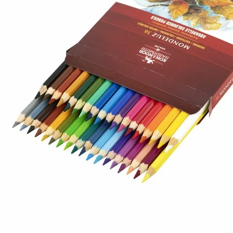 Стержни карандашей изготовлены из прессованной акварели. Это позволяет рисовать ими как простыми карандашами, после чего смоченной в воде кистью размывать нанесенные штрихи. Получаемое изображение похоже на акварельный рисунок. Набор включает 36 цветов. Материал - дерево, классический шестигранный корпус.