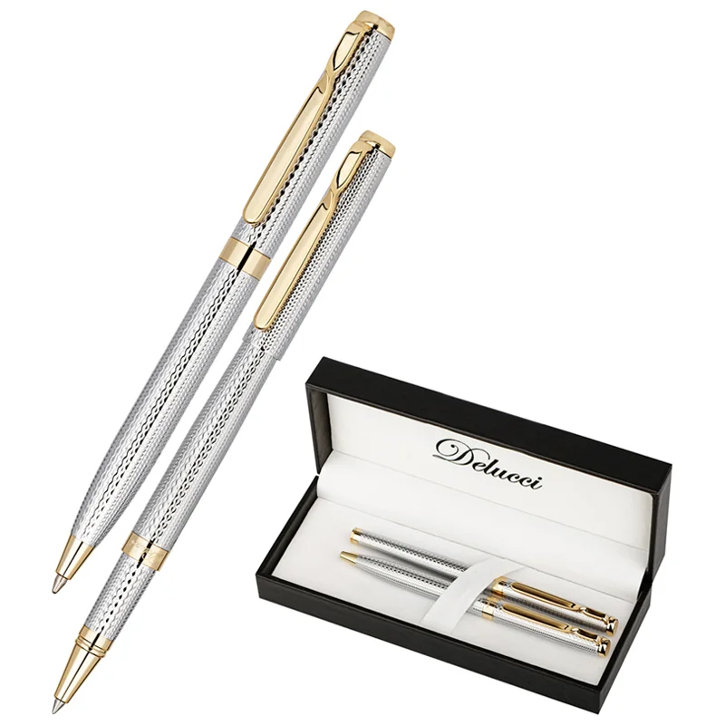 Подарочный набор Delucci Celeste – презент для настоящих ценителей. Серебристый корпус с вставками золотого цвета и интересное рифление притягивают внимание, а медный корпус с никелированием гарантирует прочность. Закрученный клип из нержавеющей стали легко крепит изделие на ежедневнике или кармане. Шариковая ручка оснащена поворотным механизмом и прекрасно подходит для мягкого вдумчивого письма благодаря линии 0,7 мм. Для быстрой же записи подойдет ручка-роллер с толщиной линии письма 0,5 мм.