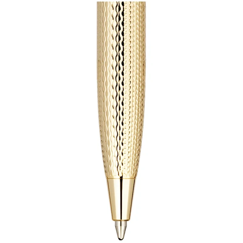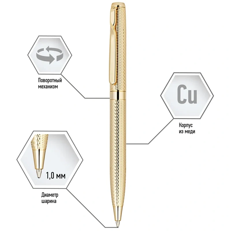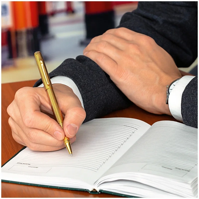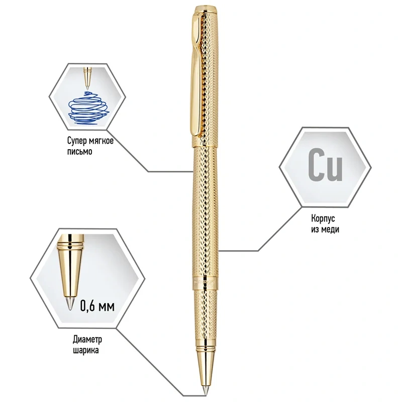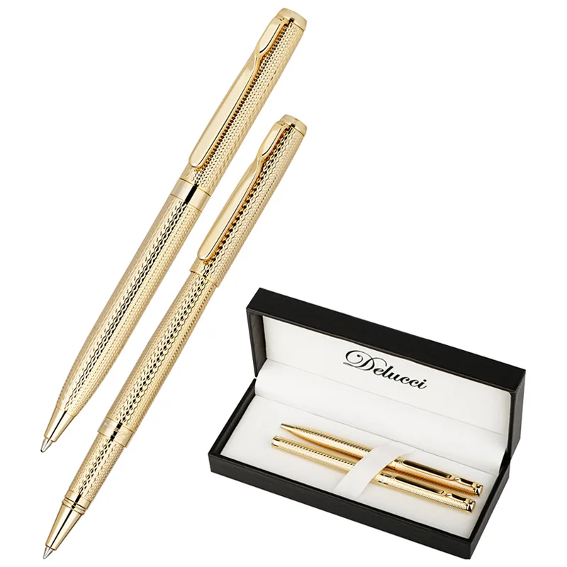 Подарочный набор Delucci Celeste подчеркнет статусность его обладателя. Золотистый цвет изделия и интересное рифление притягивают внимание, а медный корпус с никелированием гарантирует прочность. Закрученный клип из нержавеющей стали легко крепит изделие на ежедневнике или кармане. Шариковая ручка оснащена поворотным механизмом и прекрасно подходит для мягкого вдумчивого письма благодаря линии 0,7 мм. Для быстрой же записи подойдет ручка-роллер с толщиной линии письма 0,5 мм. Упакованы в футляр с откидной крышкой.