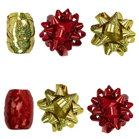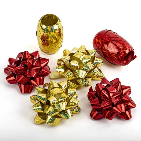 Набор состоит из 2-х лент шириной 5 мм и длиной 10 м каждая, а также из 4-х бантов-звезд диаметром 7,5 см. Товар представлен в 2-х цветах с голографическим эффектом: красном и золотистом. Ленты и банты выполнены из прочного полипропилена (70%), полиэтилена (15%) и полиэтилентерефталата (15%). Банты являются самоклеящимися. Для того, чтобы прикрепить бантик, необходимо отклеить стикер с обратной стороны банта по линии перфорации и плотно прижать бант к поверхности. Набор упакован в ПВХ-коробку.