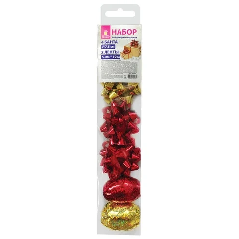 Набор для декора и подарков 4 банта, 2 ленты, голография, цвета красный, золото, ЗОЛОТАЯ СКАЗКА, 591