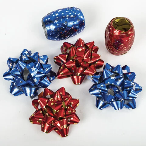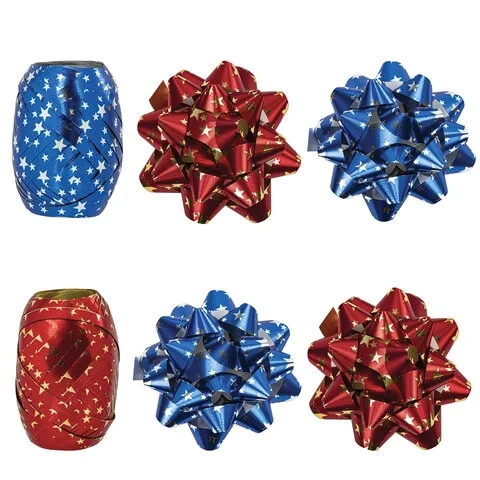 Набор состоит из 2-х лент шириной 5 мм и длиной 10 м каждая, а также из 4-х бантов-звезд диаметром 7,5 см. Товар представлен в 2-х цветах с рисунком 'звезды' с эффектом металлик: синем и красном. Ленты и банты выполнены из прочного полипропилена (70%), полиэтилена (15%) и полиэтилентерефталата (15%). Банты являются самоклеящимися. Для того, чтобы прикрепить бантик, необходимо отклеить стикер с обратной стороны банта по линии перфорации и плотно прижать бант к поверхности. Набор упакован в ПВХ-коробку.