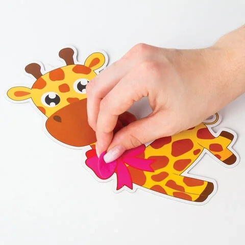 В набор входит яркая картонная основа в форме жирафа размером не более 20х15 см с напечатанным дизайном аппликации, разработанным дизайнерами ЮНЛАНДИЯ специально для детей, а также 8 листов фетра разных цветов. Фетровые элементы аппликации перфорированы и имеют клеевой слой, что позволяет создать аппликацию без клея и ножниц. Также в набор входит картонная подставка с клеевым слоем, на которую можно установить готовую аппликацию.