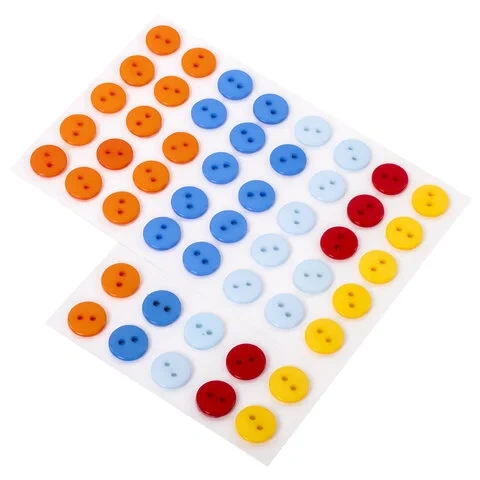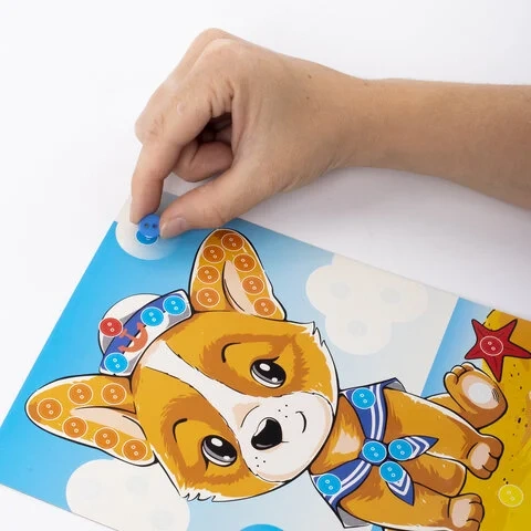 Цветом и контуром на картинке обозначены места, куда необходимо приклеить пуговицы соответствующего цвета. Пуговицы размещены на прозрачной плёнке и имеют клеевой слой, что позволяет создать аппликацию без клея. В каждом наборе имеются запасные элементы.