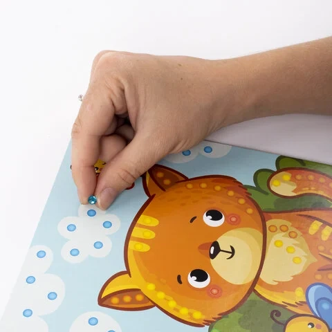 В набор входит яркая картонная основа размером 20х15 см с напечатанным дизайном аппликации, разработанным дизайнерами ЮНЛАНДИЯ специально для детей, а также самоклеящиеся стразы 5 разных цветов диаметром 5 мм.