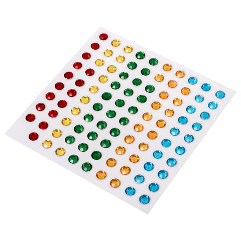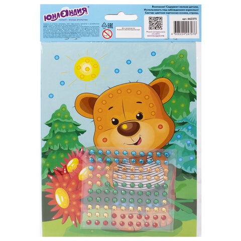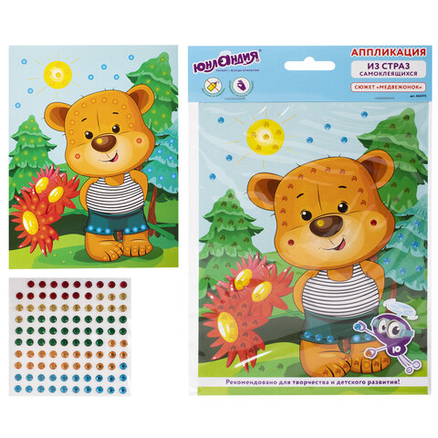 В набор входит яркая картонная основа размером 20х15 см с напечатанным дизайном аппликации, разработанным дизайнерами Юнландия специально для детей, а также самоклеящиеся стразы 5 разных цветов диаметром 5 мм.