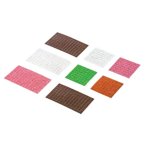 В набор входит яркая картонная основа размером 21х29 см с напечатанным дизайном аппликации, а также 5 листов мягкого пластика разных цветов с голографическим эффектом. Белыми пронумерованными квадратиками на картинке обозначены места, куда необходимо приклеить элементы соответствующего цвета. Схема соответствия номеров и цветов расположена на бумажном вкладыше.