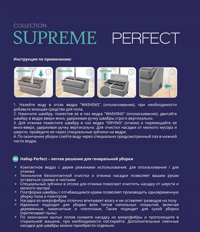 Швабра с отжимом и ведром Hitt Supreme Perfect - это инновационное легкое решение для генеральной уборки. Бесконтактный отжим позволяет мыть полы без перчаток, ваши руки всегда остаются ухоженными. Швабра с отжимом и ведром на два отсека позволяет ополаскивать и отжимать насадку. Специальные зубчики в отсеке для отжима помогают очистить микрофибру от шерсти и мелкого мусора. Швабра с ведром имеет ряд преимуществ: - Платформа с отгибающимся краем позволяет производить одновременную уборку пола и плинтусов; - Легко мыть углы и плинтусы. Поворот основания на 180С; - Насадка из микрофибры отлично впитывает влагу, не оставляет разводы на полу. Можно стирать насадку в стиральной машине; - Ведро изготовлено из прочного пластика и имеет отверстие для слива. Ручка - из нержавеющей стали, насадка- из 100 % микрофибры. Ведро со шваброй и отжимом компактно и занимает мало места при хранении.