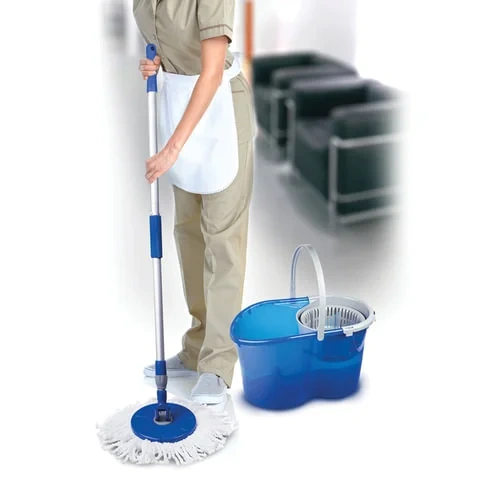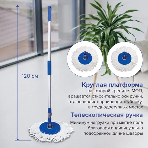 В набор входят: ведро с системой отжима, швабра с круглой насадкой из микрофибры и запасная насадка. Отжим осуществляется нажатием ручки по направлению вниз. Круглая платформа, на которой крепится МОП, вращается относительно оси ручки, что позволяет производить уборку в труднодоступных местах (например, под мебелью). Отжим - центрифуга, приводящаяся в действие нажатием на ручку швабры. Объем ведра из пластика - 14/5 л. Рукоятка телескопическая, позволяет подобрать наиболее удобную длину. Моющий элемент МОПа из микрофибрs чистит без моющих средств. Комплект выполнен в синем цвете.