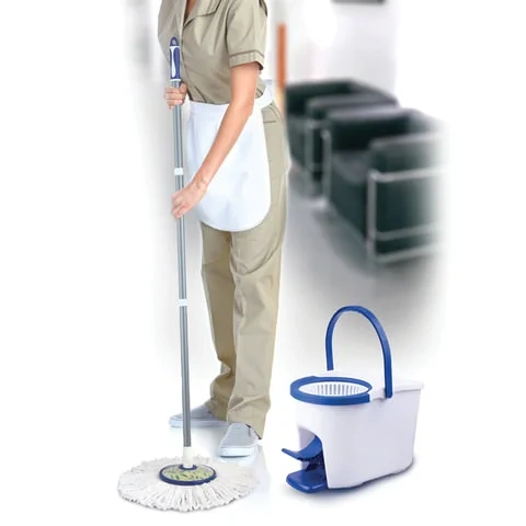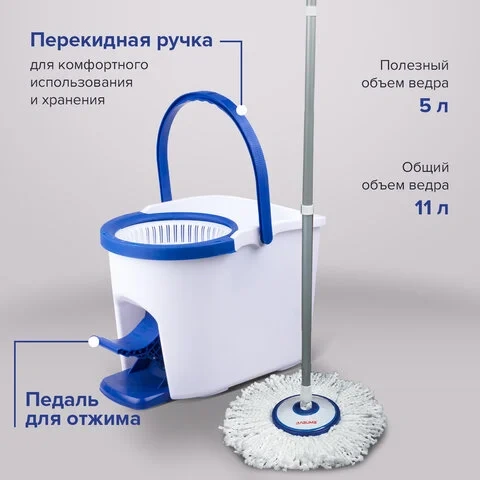 В набор входят: ведро с системой отжима, швабра с круглой насадкой из микрофибры и запасная насадка. Отжим осуществляется нажатием ручки по направлению вниз. Круглая платформа, на которой крепится МОП, вращается относительно оси ручки, что позволяет производить уборку в труднодоступных местах (например, под мебелью). Отжим - центрифуга, приводящаяся в действие нажатием на ручку швабры. Объем ведра из пластика - 11/5 л. Рукоятка телескопическая, позволяет подобрать наиболее удобную длину. Моющий элемент МОПа из микрофибры чистит без моющих средств. Комплект выполнен в белом цвете.