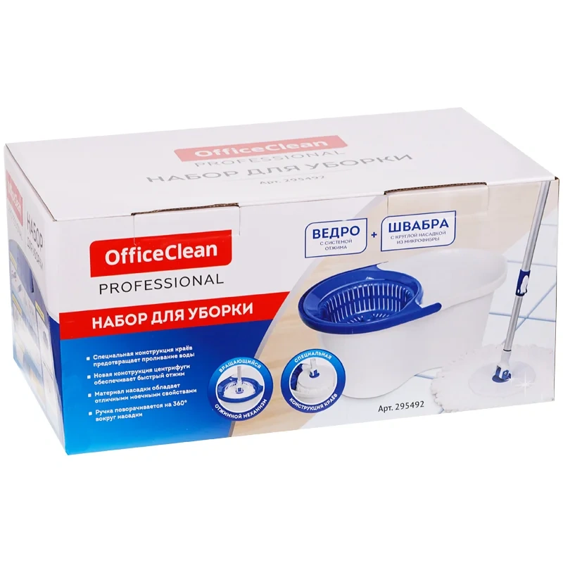 Удобный и практичный набор для влажной уборки помещений OfficeClean Professional. Комплектация набора:1. пластиковое ведро 7 л (полезный объем 5 л) с системой отжима;2. разборная ручка из стали;3. круглая насадка из микрофибры с флаундером.Преимущества набора:1. специальная конструкция краев предотвращает проливание воды; 2. новая конструкция центрифуги обеспечивает быстрый отжим;3. материал насадки обладает отличными моющими свойствами.4. ручка поворачивается на 360° вокруг насадки.К швабре из данного набора подходит сменная насадка - 266754.Набор для уборки OfficeClean Professional является оптимальным решением для осуществления тщательной и комфортной уборки в доме и офисе небольшой площади.