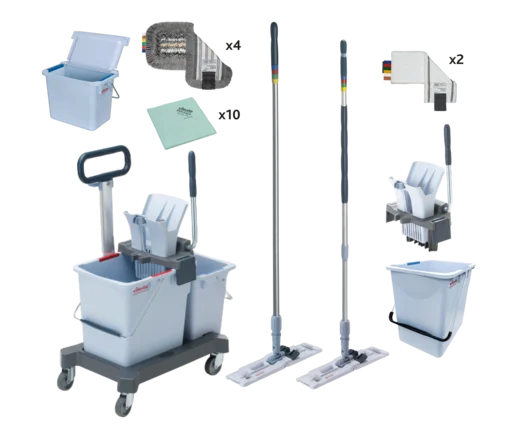 Набор разработан специально для медицинских объектов. В комплект входит продуманная комплектация для устранения ежедневных загрязнений на полу и поверхностях, а также для проведения генеральной уборки. Используется цветовое кодирование для исключения перекрестных загрязнений. В набор входят только популярные товары по выгодной цене. Достаточный запас расходных материалов, таких как мопы и салфетки, позволяет экономить время на их поиск, заказ и доставку. Обработка поверхностей осуществляется с помощью микроволокна. Инвентарь отличается эргономичностью, высоким качеством, износостойкостью и прочностью, что обеспечивает длительный срок службы и гарантию качества.Комплектация