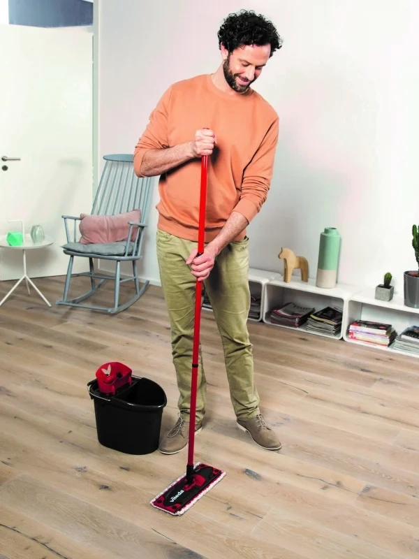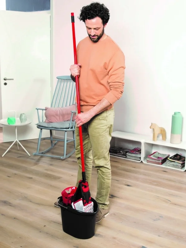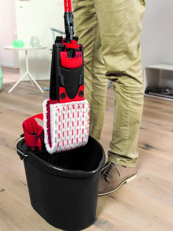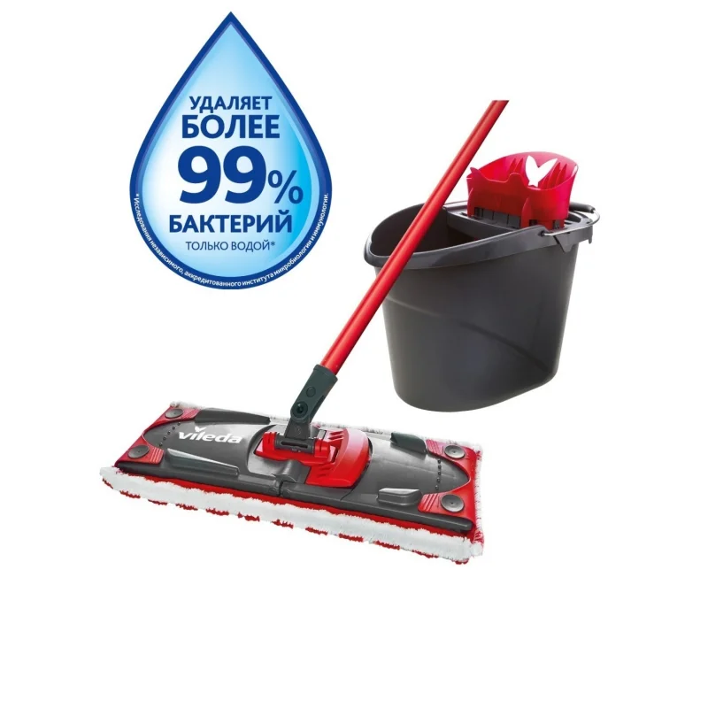 Уборка 'не замочив рук' возможна с набором для уборки Vileda Ультрамакс. Ваши руки останутся сухими и чистыми, т.к. швабру за вас отожмет специально сконструированная насадка-воронка на ведре, в которую нужно просто опустить насадку швабры и слегка нажать на нее. Далее легкими движениями, 'рисуя' на полу восьмерки, собирайте насадкой из микрофибры высокой впитываемости все загрязнения. После уборки, легко слейте использованную воду через носик слива ведра, удерживая ведро за выемку в его дне.