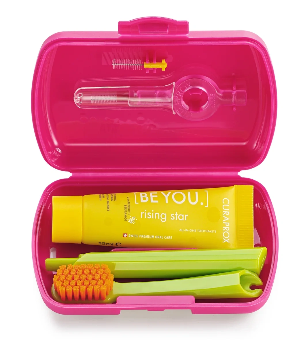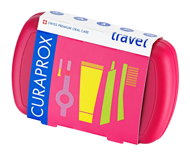 Дорожный набор нового поколения Curaprox Be You в красном боксе. В набор входят удобный футляр, мини-версия зубной пасты Be You со вкусом грейпфрута и бергамота, складная зубная щетка Curaprox CS5460, межзубные ершики CPS prime 07 и CPS prime 09 и держатель UHS 409. В состав зубной пасты Be You входит наногидроксиапатит, который реминерализует эмаль зубов и снижает чувствительность. Фермент глюкооксидаза поддерживает защитные функции слюны, борется с вредными бактериями и бережно осветляет эмаль. Цветные гранулы с ментолом в составе пасты способствуют длительной свежести дыхания. Зубная щетка Curaprox CS 5460 обладает сверхтонкой ультрамягкой щетиной из высококачественного полиэстерового волокна. Нежные ворсинки эффективно очищают поверхность зубов, не травмируя зубную эмаль. Ершики CPS prime 07 и CPS prime 09 обеспечивают полное удаление зубного налета в межзубных промежутках. Благодаря держателю UHS 409 с системой click, ершик можно легко установить в держателе одним движением. Такой набор станет незаменимым спутником в путешествиях.