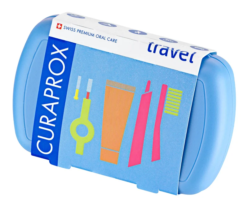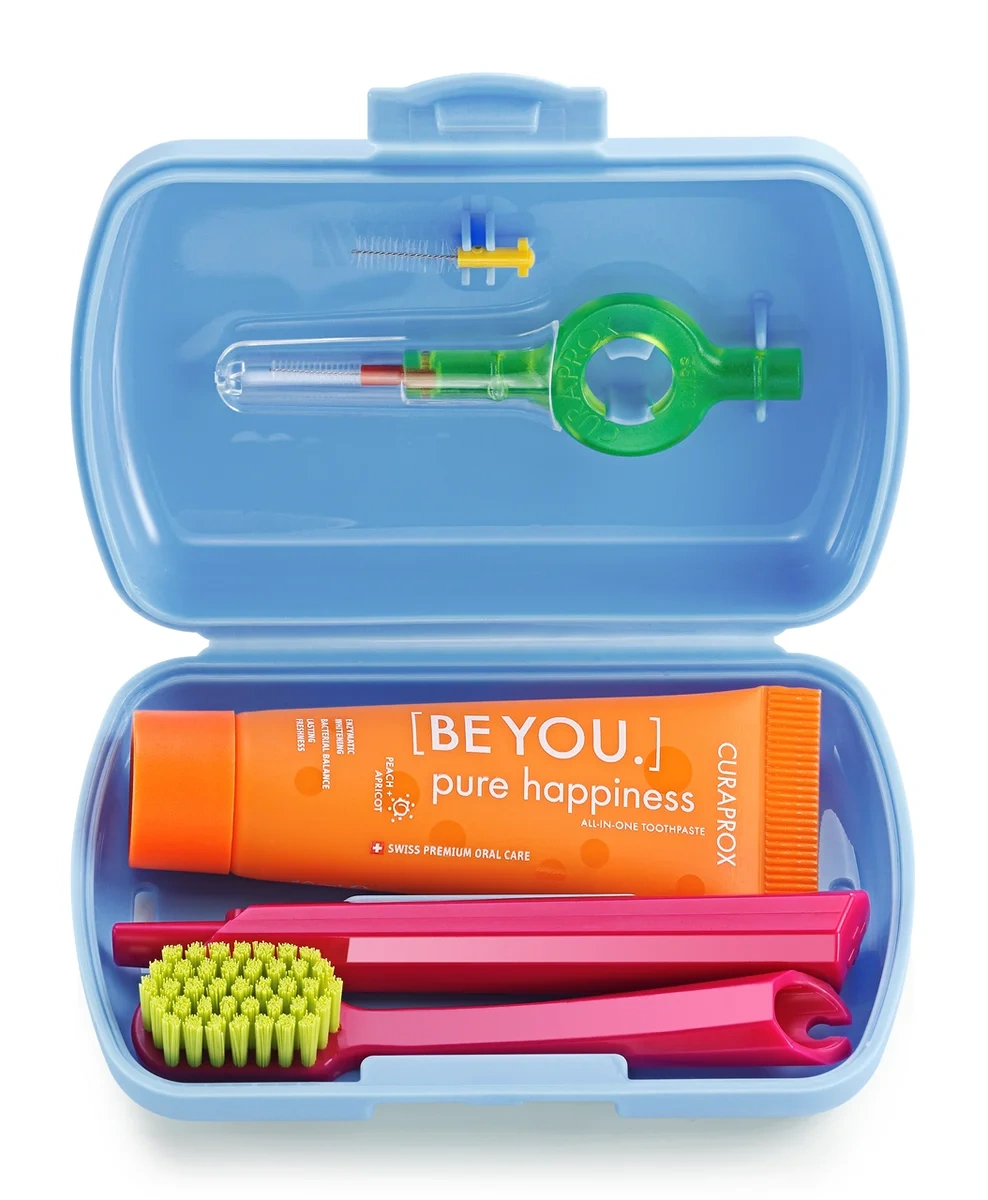 Дорожный набор нового поколения Curaprox Be You в голубом боксе. В набор входят удобный футляр, мини-версия зубной пасты Be You со вкусом персика и абрикоса, складная зубная щетка Curaprox CS5460, межзубные ершики CPS prime 07 и CPS prime 09 и держатель UHS 409. В состав зубной пасты Be You входит наногидроксиапатит, который реминерализует эмаль зубов и снижает чувствительность. Фермент глюкооксидаза поддерживает защитные функции слюны, борется с вредными бактериями и бережно осветляет эмаль. Цветные гранулы с ментолом в составе пасты способствуют длительной свежести дыхания. Зубная щетка Curaprox CS 5460 обладает сверхтонкой ультрамягкой щетиной из высококачественного полиэстерового волокна. Нежные ворсинки эффективно очищают поверхность зубов, не травмируя зубную эмаль. Ершики CPS prime 07 и CPS prime 09 обеспечивают полное удаление зубного налета в межзубных промежутках. Благодаря держателю UHS 409 с универсальной системой click, ершик можно легко установить в держателе одним движением. Такой набор станет незаменимым спутником в путешествиях.