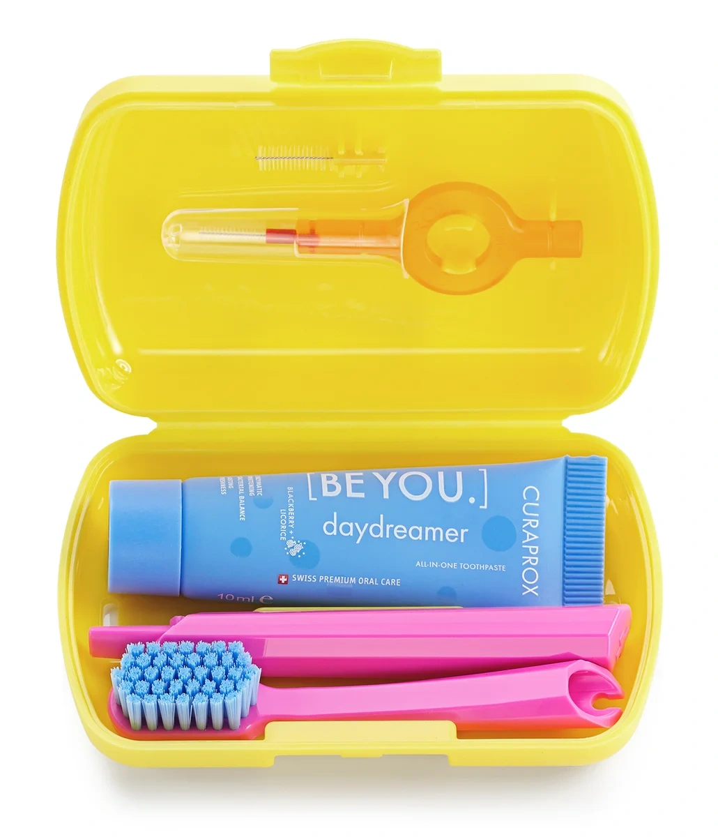 Дорожный набор нового поколения Curaprox Be You в желтом боксе. В набор входят удобный футляр, мини-версия зубной пасты Be You со вкусом ежевики и лакрицы, складная зубная щетка Curaprox CS5460, межзубные ершики CPS prime 07 и CPS prime 09 и держатель UHS 409.З В состав зубной пасты Be You входит наногидроксиапатит, который реминерализует эмаль зубов и снижает чувствительность. Фермент глюкооксидаза поддерживает защитные функции слюны, борется с вредными бактериями и бережно осветляет эмаль. Цветные гранулы с ментолом в составе пасты способствуют длительной свежести дыхания. Зубная щетка Curaprox CS5460 обладает сверхтонкой ультрамягкой щетиной из высококачественного полиэстерового волокна. Нежные ворсинки эффективно очищают поверхность зубов, не травмируя зубную эмаль. Ершики CPS prime 07 и CPS prime 09 обеспечивают полное удаление зубного налета в межзубных промежутках. Благодаря держателю UHS 409 с универсальной системой click, ершик можно легко установить в держателе одним движением. Такой набор станет незаменимым спутником в путешествиях.
