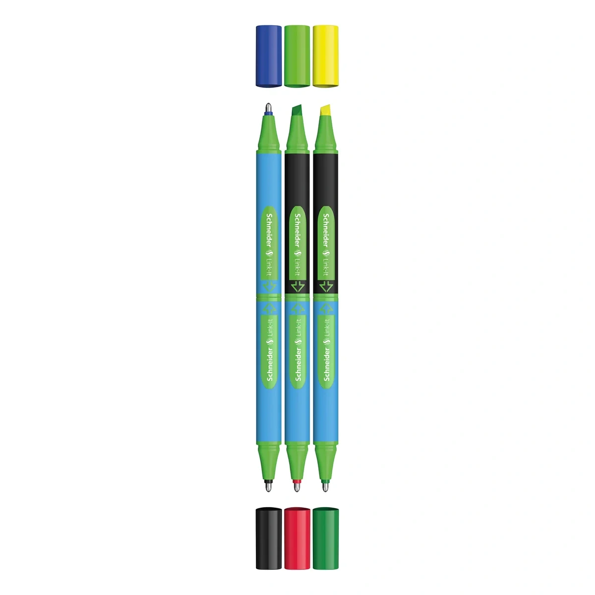 Набор шариковых ручек Schneider Slider Link-It в ярком дизайне. В набор входят 4 шариковых ручки синего, черного, красного и зеленого цвета, а также два текстовыделителя желтого и зеленого цвета. Уникальная модульная система Click! позволяет соединить две половины ручки в одно целое, т. е. шесть разных половинок можно комбинировать между собой. Диаметр пишущего узла ручки составляет 1,4 мм, толщина линии письма – 0,7 мм. Упакованы в картонную упаковку с европодвесом.