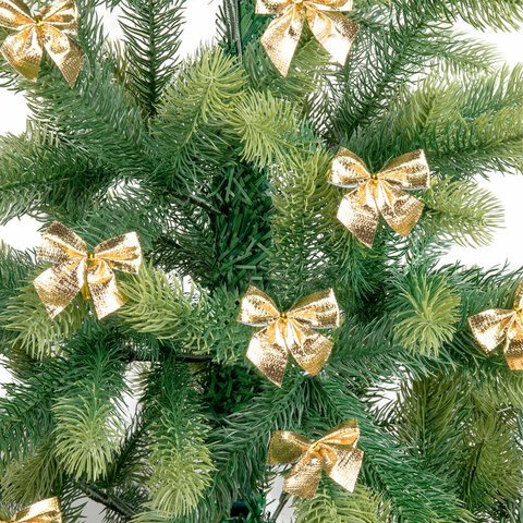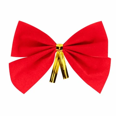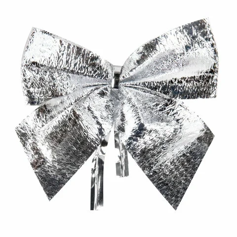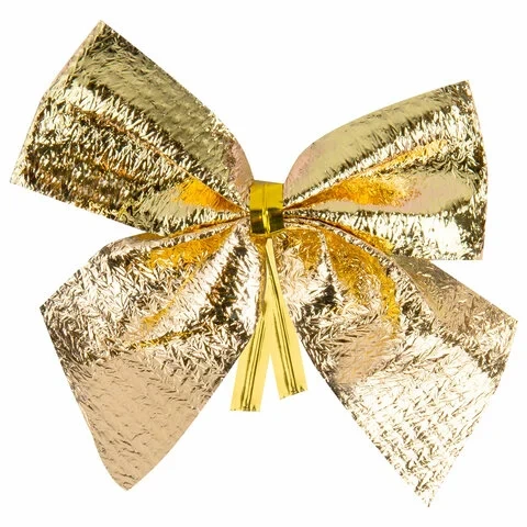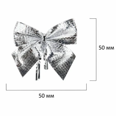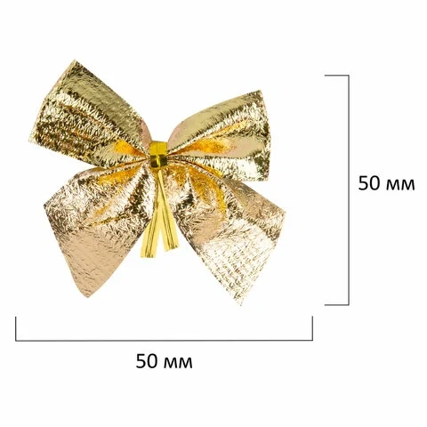 В комплекте 12 бантиков. Поставляются в 3 цветах: золотистый, серебристый, красный. В промежуточной упаковке представлено 3 цвета. Размер украшений – 5x5 см. Материал – полиэстер. Упакованы в пакет с европодвесом.