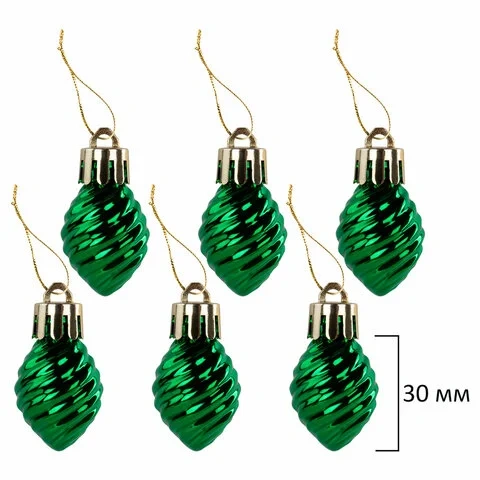 6 украшений зеленого цвета в виде шишек с глянцевым эффектом (размер 3 см),