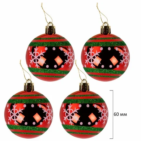 4 шара красного цвета с зеленым рисунком с глянцевым эффектом (диаметр 6 см),