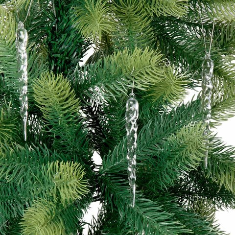 В наборе 12 сосулек. Размер украшений - 11,5 см. Материал - акрил. Упакованы в прозрачную коробку из ПВХ.