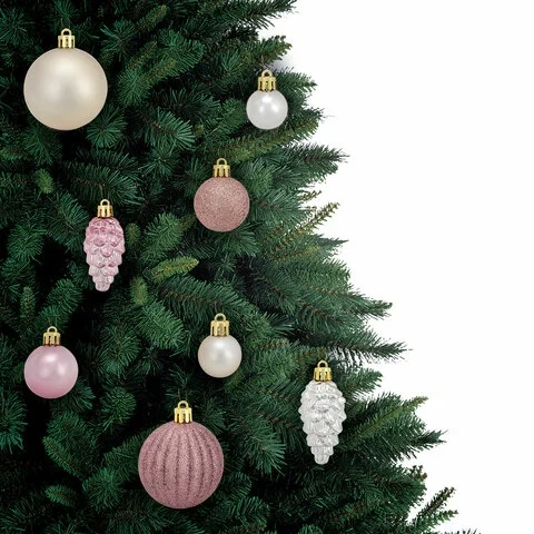 Набор декоративных украшений для новогодней ели разной формы: сферической формы, в форме шишки, пятиконечной звезды.